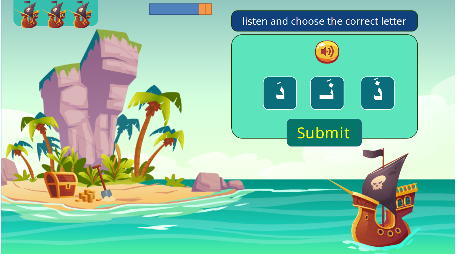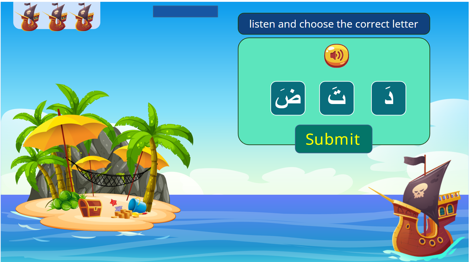 A game where players journey toward the treasure by answering questions in Arabic about similarities—whether similarities in writing or pronunciation. It’s an exciting game designed for advanced-level children to help them learn and practice the correct pronunciation of Arabic letters..